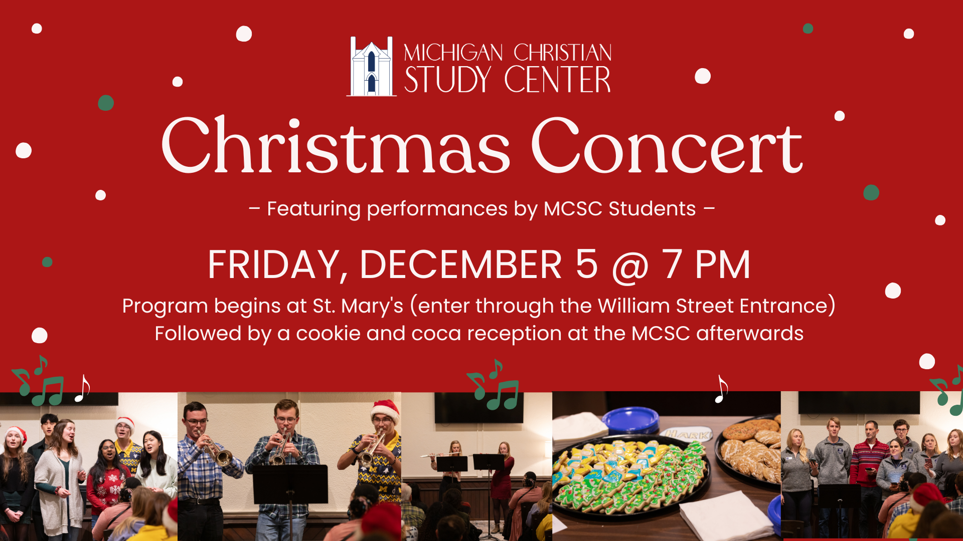 Christmas Concert Friday, December 5, 2025 7:00 PM 8:00 PM Michigan Christian Study Center 611 East William Street Ann Arbor, MI, 48104 United States (map) Google Calendar ICS