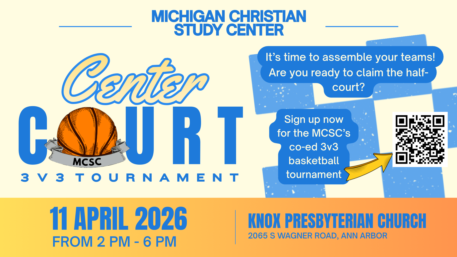 MCSC 3v3 Basketball Tournament - Center Courth Saturday, April 11, 2026 2:00 PM 6:00 PM Michigan Christian Study Center 611 East William Street Ann Arbor, MI, 48104 United States (map) Google Calendar ICS Sign-up