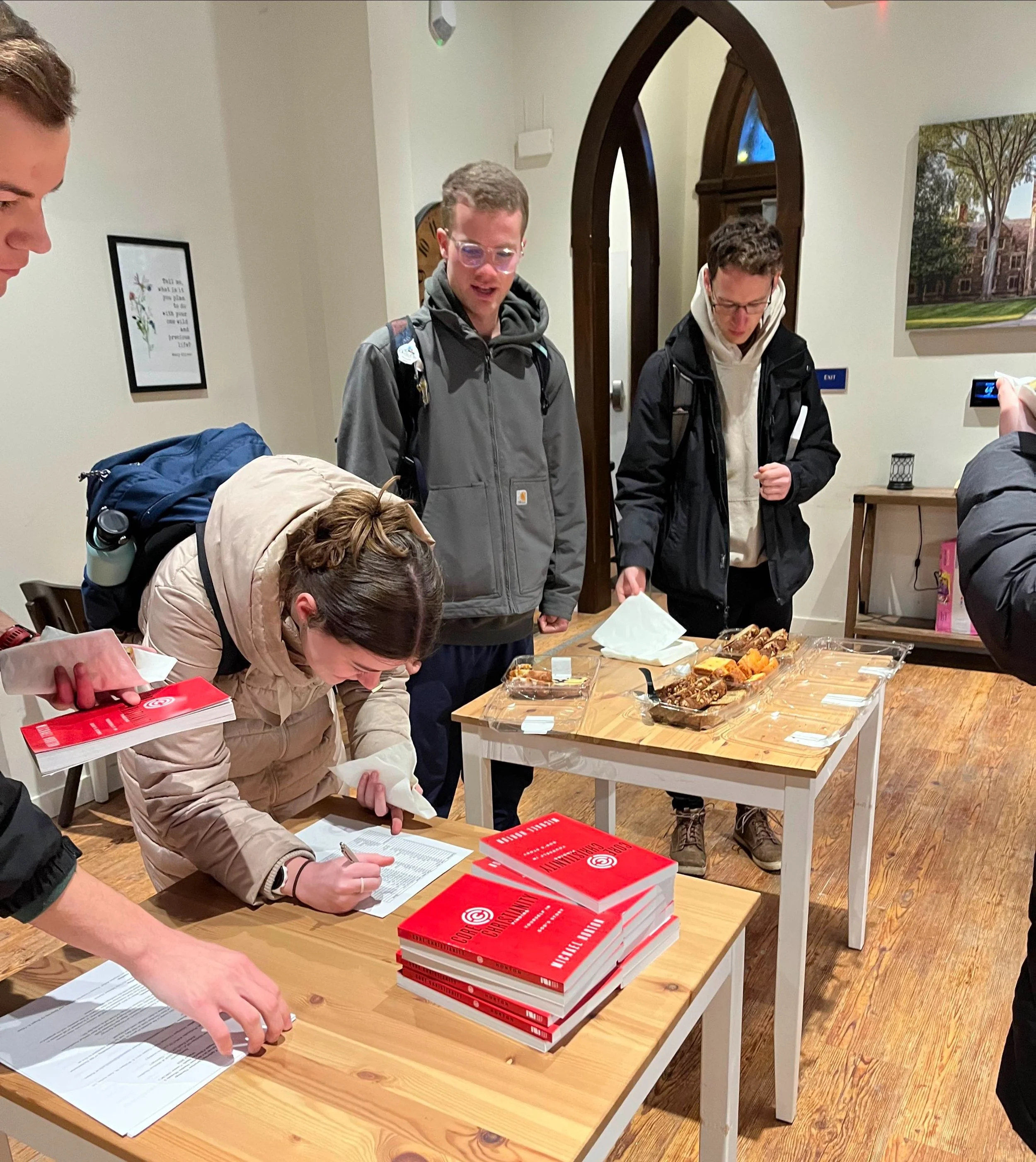 Students receiving textbooks (and breakfast) for Theology class